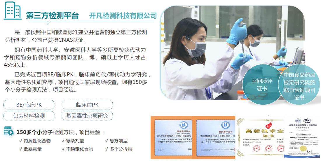 健晖拥有战略合作的生物样本检测公司--合肥市开凡检测科技有限公司,团队经验丰富,已完成近百项临床试验生物样本分析工作。